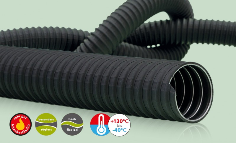 E13/60 , Bis +130° C beständiger, zugfester Spiralschlauch, Flexschlauch, Ansaugschlauch. Aus zwei Lagen thermoplastischem Elastomer (TPE) mit ummantelter Federstahlspirale und zusätzlicher axialer und radialer Fadenverstärkung. Dieser Aufbau gibt diesem Schlauchtyp besondere Eigenschaften und macht ihn zu einem vielseitig einsetzbaren Qualitätsprodukt. Zum universellen Einsatz im mittleren Temperaturbereich von -40°C bis +130°C geeignet.